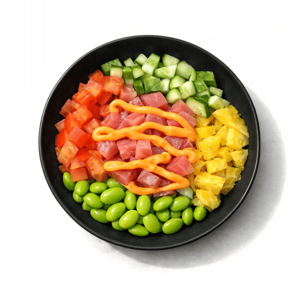 Поке с тунцом под соусом спайси , бобы эдаме, огурчик, томат, ананас, подается с фирменным сладковато пряным соусом томикацу