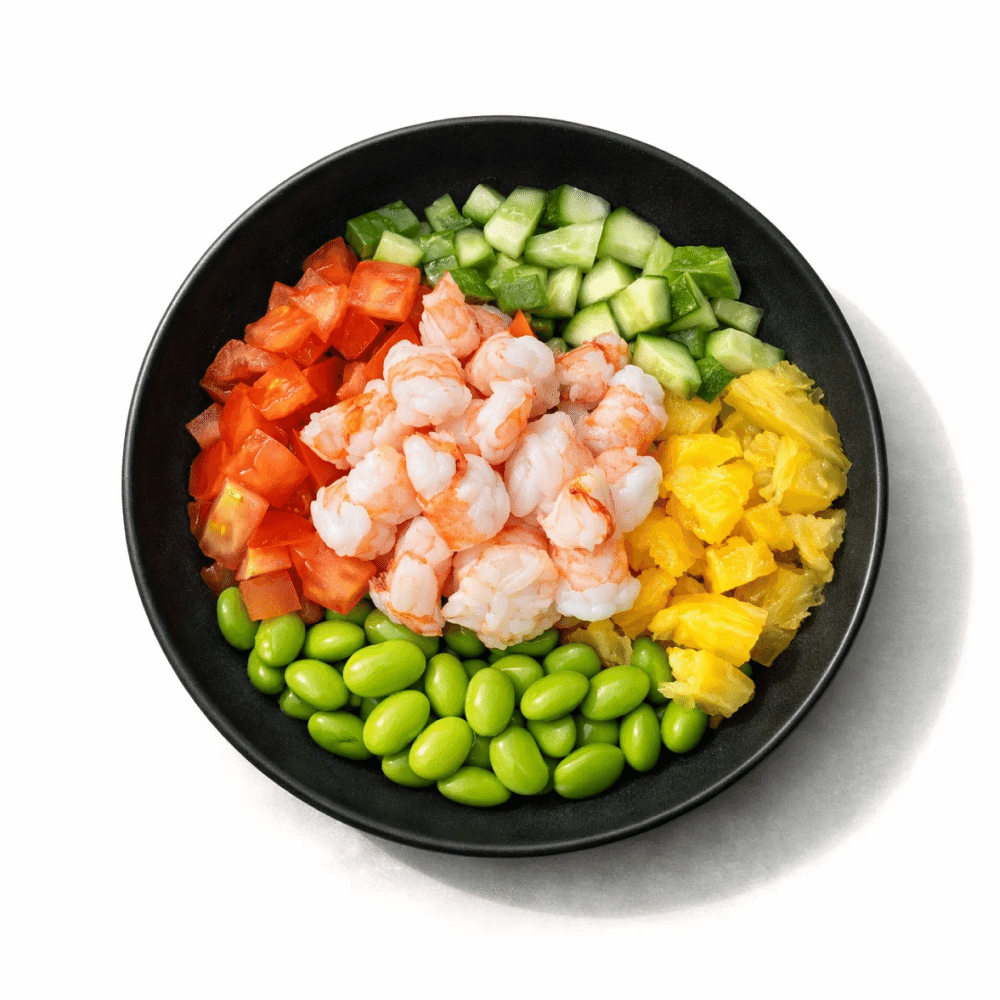 Поке с креветками под соусом терияки , бобы эдаме, огурчик, томат, ананас, подается с фирменным сладковато пряным соусом томикацу