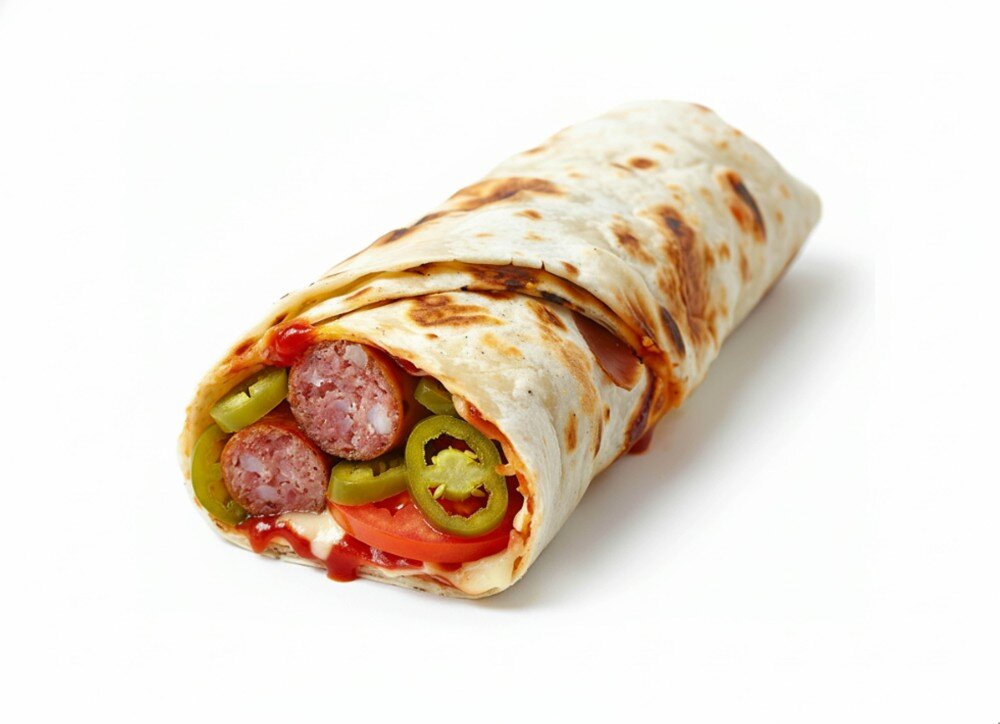 Ролл с копчеными баварскими колбасками, острым перцем халапеньо, маринованным огурцом, соусом BBQ, помидором и моцареллой в тонкой лепешке.