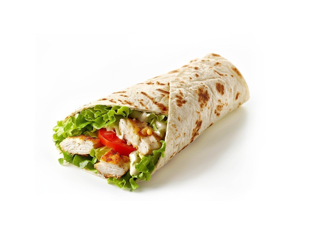 Легкий летний цезарь-ролл в тонкой пшеничной тортилье с соусом ранч, цыпленком, томатами, хрустящим салатом айсберг и моцареллой.