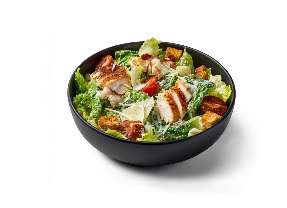 Классический салат цезарь с хрустящим айсбергом, обжаренного в соусе сладкий чили куриного филе, помидорок черри, пармезана, соуса цезарь и хрустящих сухарей.