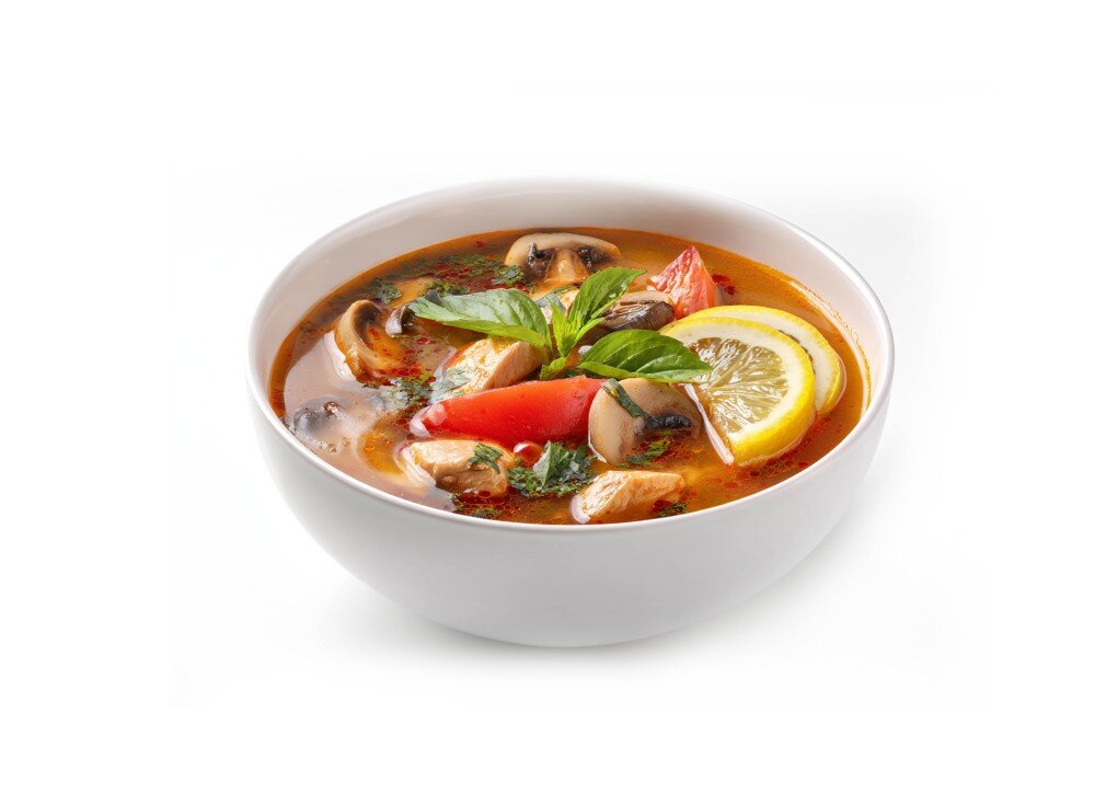 Горячий и насыщенный суп том ям с курицей. В его составе: бульон том ям, куриный бульон, лук, морковь, кокосовое молоко, соль, сахар, лимон, чеснок, шампиньоны и курица.
