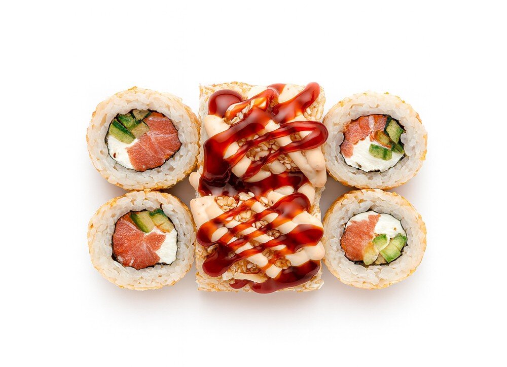 Специальный гость в твоем заказе ! Лосось, сыр, огурчик, соус ореховый и соус терияки, кунжут.